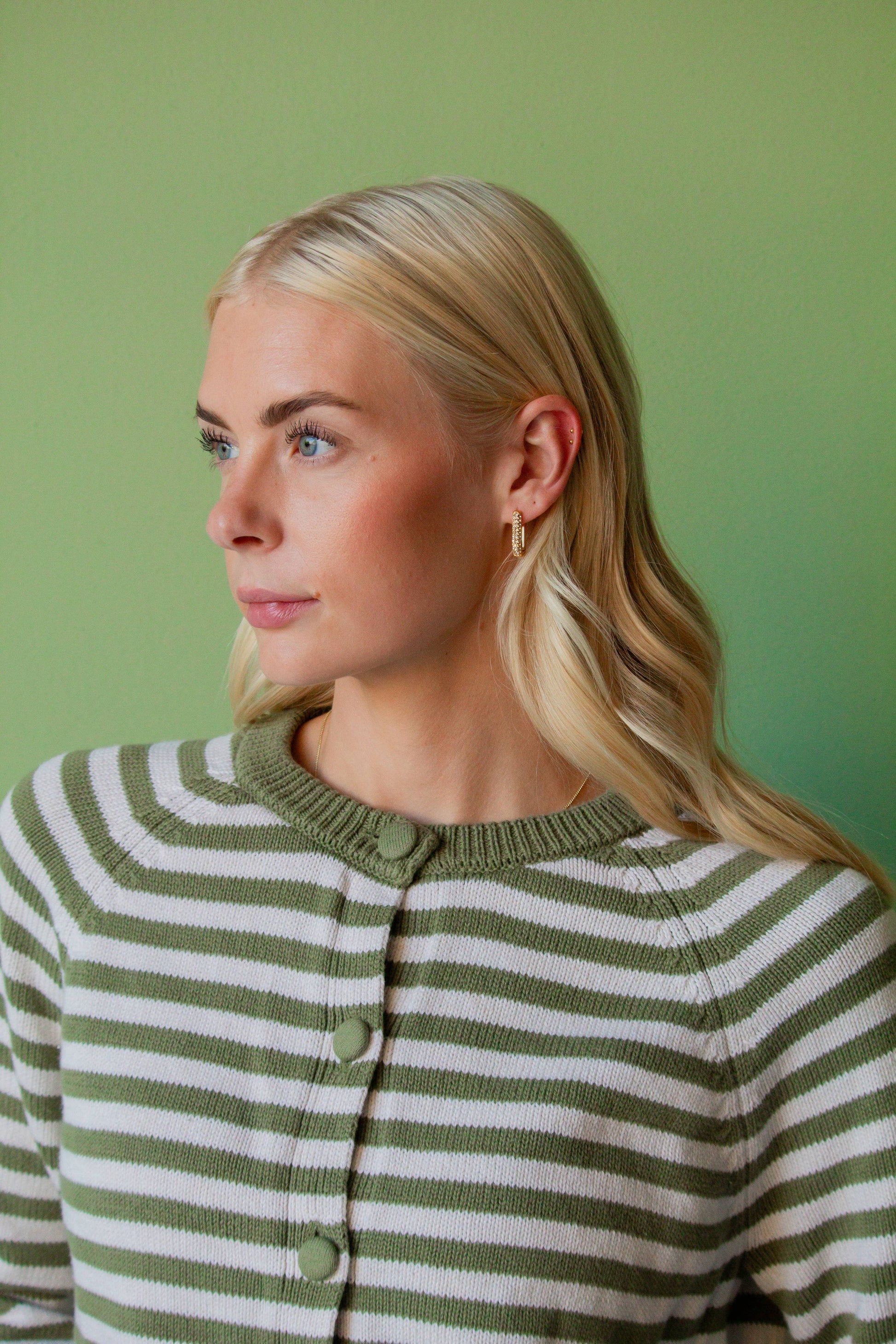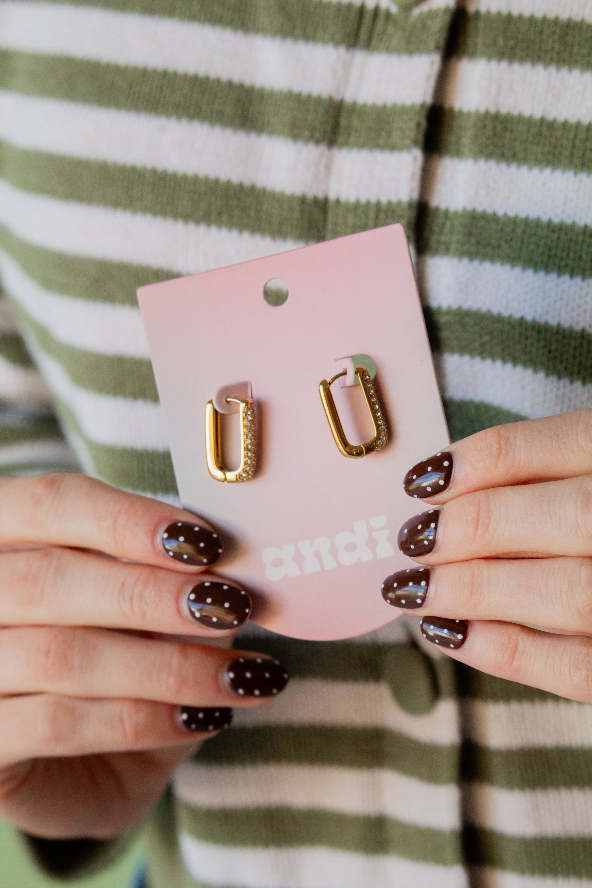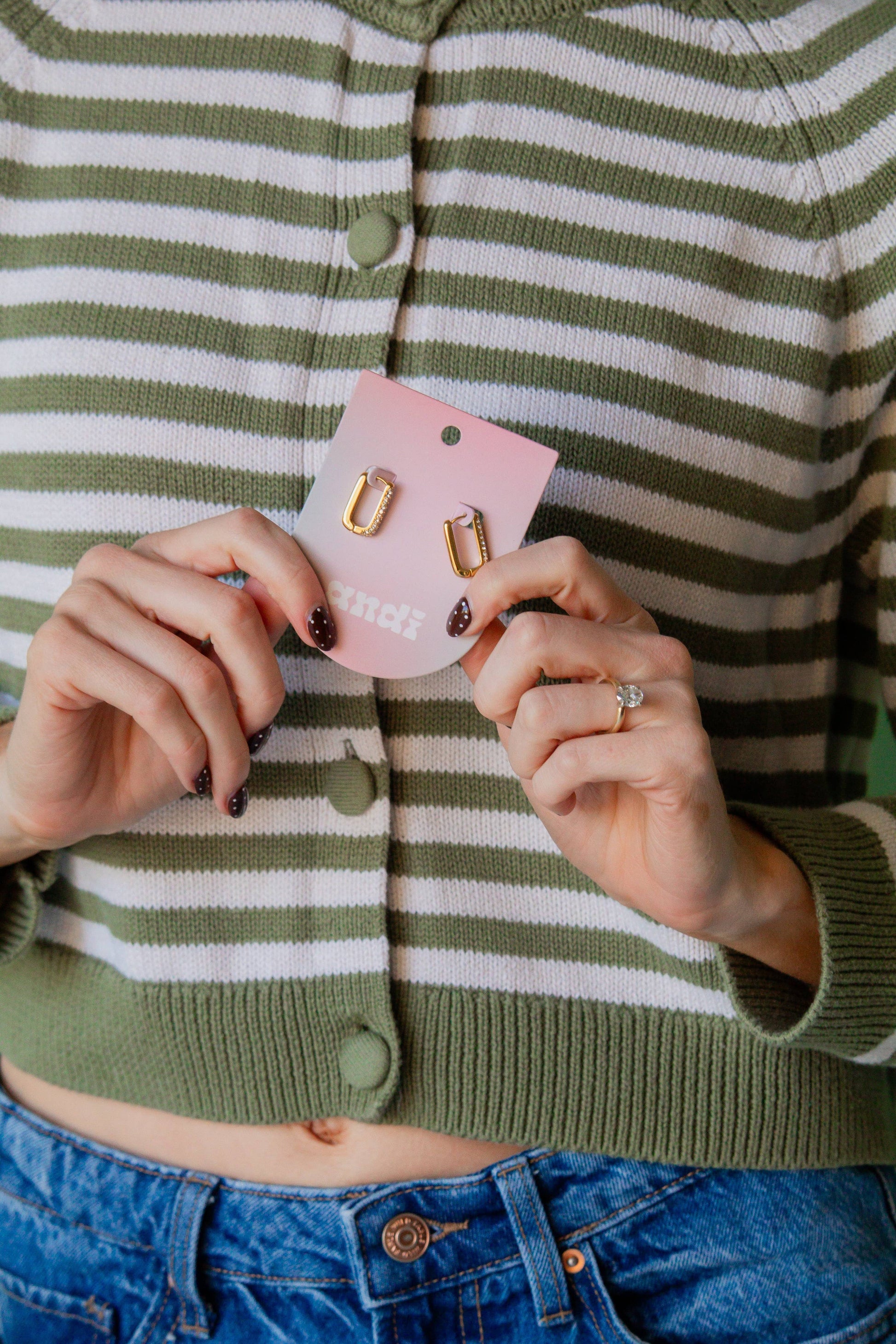 These are the absolute cutest staple earrings! They're the prettiest simple gold rectangular hoop accented with the cutest crystals. Because they're stainless steel, they are hypoallergenic/water resistant and perfect for any occasion!