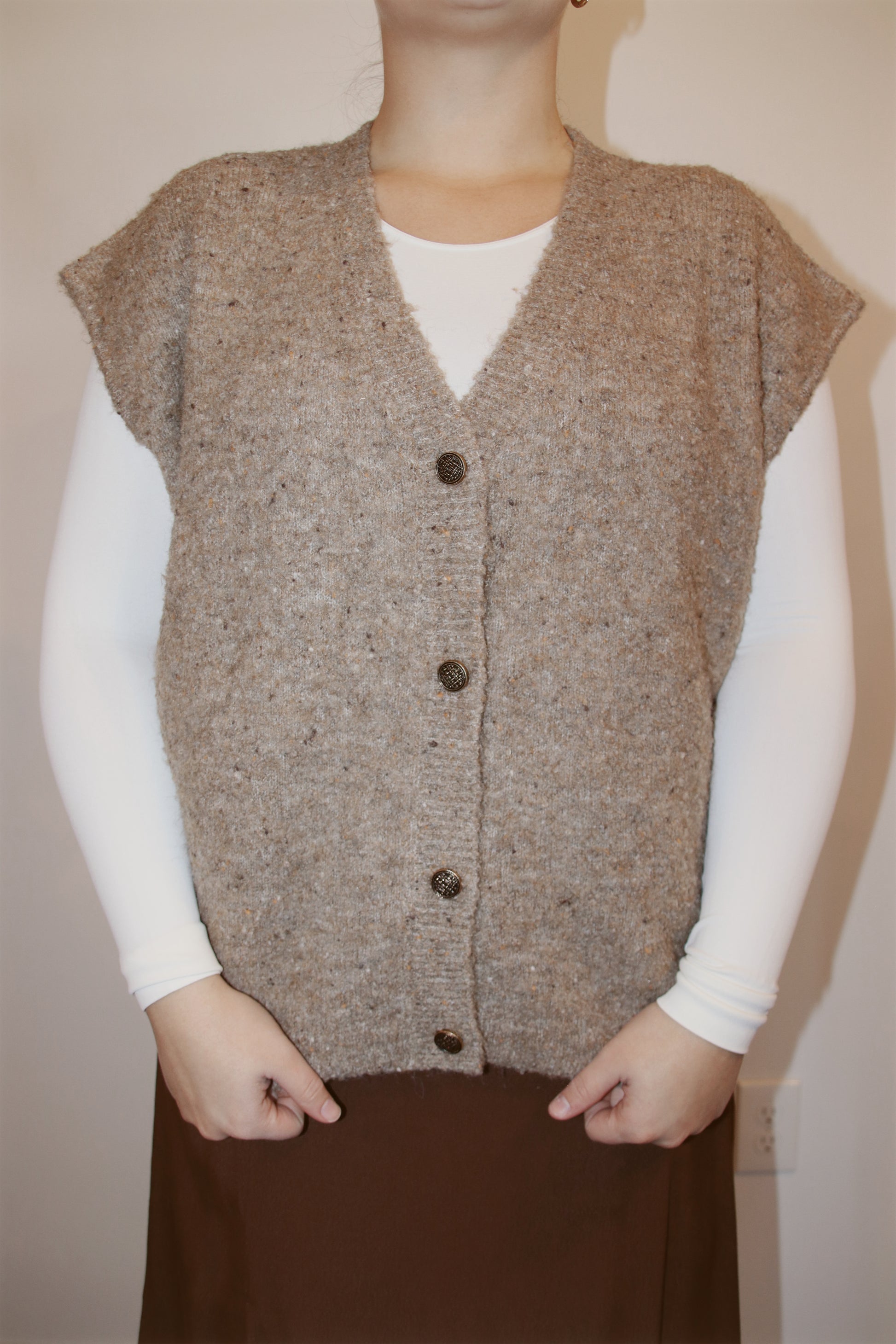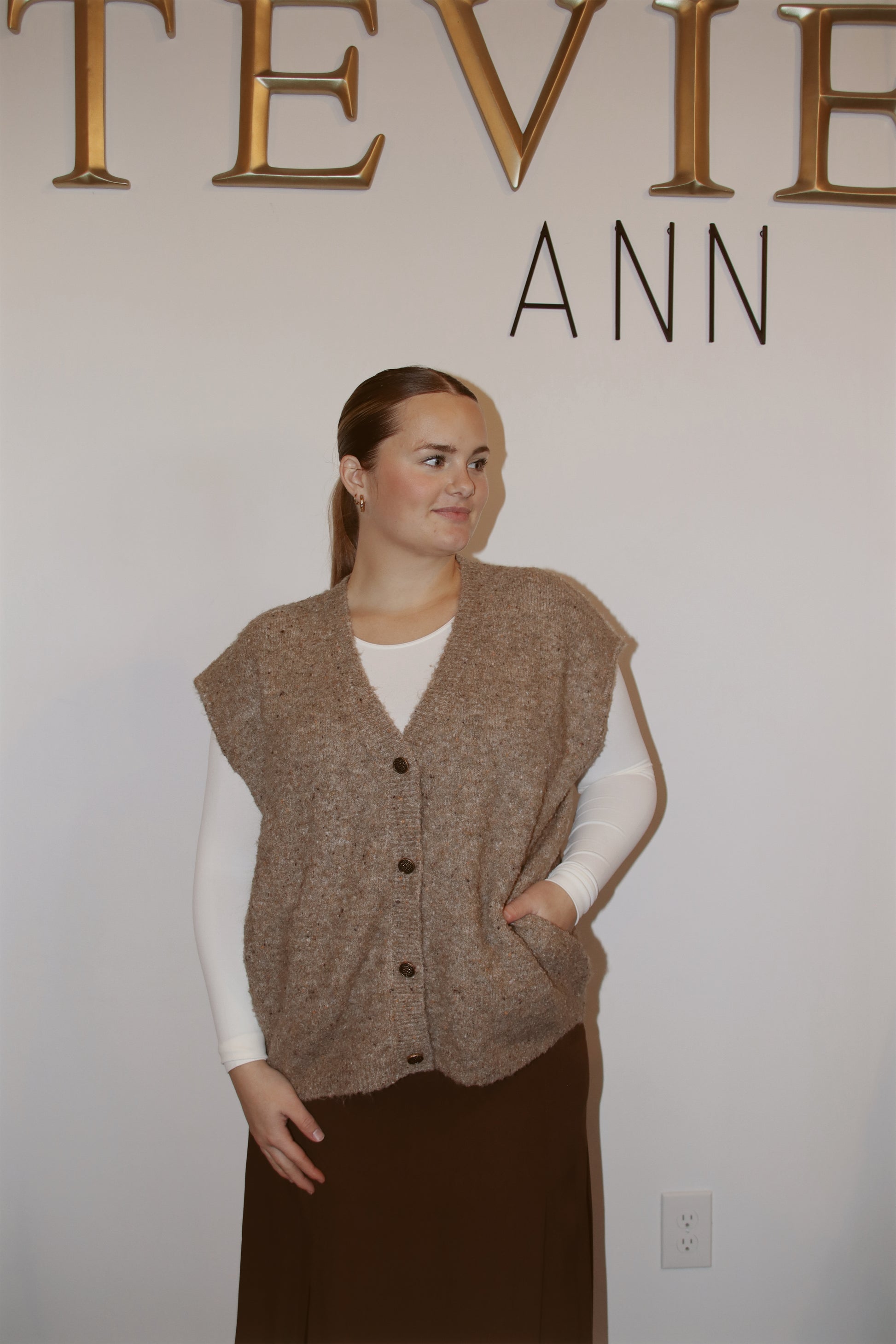 Your new go-to for effortless layering. This slouchy, oversized vest features soft textured knit fabric, classic button details, and an easy silhouette that pairs beautifully with everything from denim to flowy skirts. Perfectly cozy with just the right amount of structure — she’s made for coffee runs, slow Sundays, and crisp winter mornings.