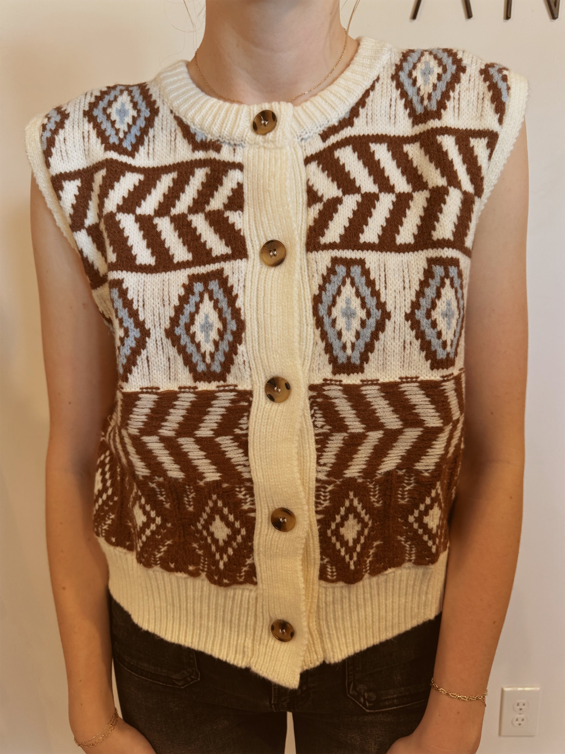 The Autumn Sketch Sweater Vest is the ultimate layering piece with a playful twist. Designed with a classic button-front closure and knit construction, this vest brings both comfort and style to your wardrobe. The bold graphic detail adds a fun, standout element, while the sleeveless cut makes it easy to layer over tees, blouses, or turtlenecks. Perfect for transitioning seasons, it pairs effortlessly with denim, skirts, or trousers for a look that’s equal parts chic and cozy.