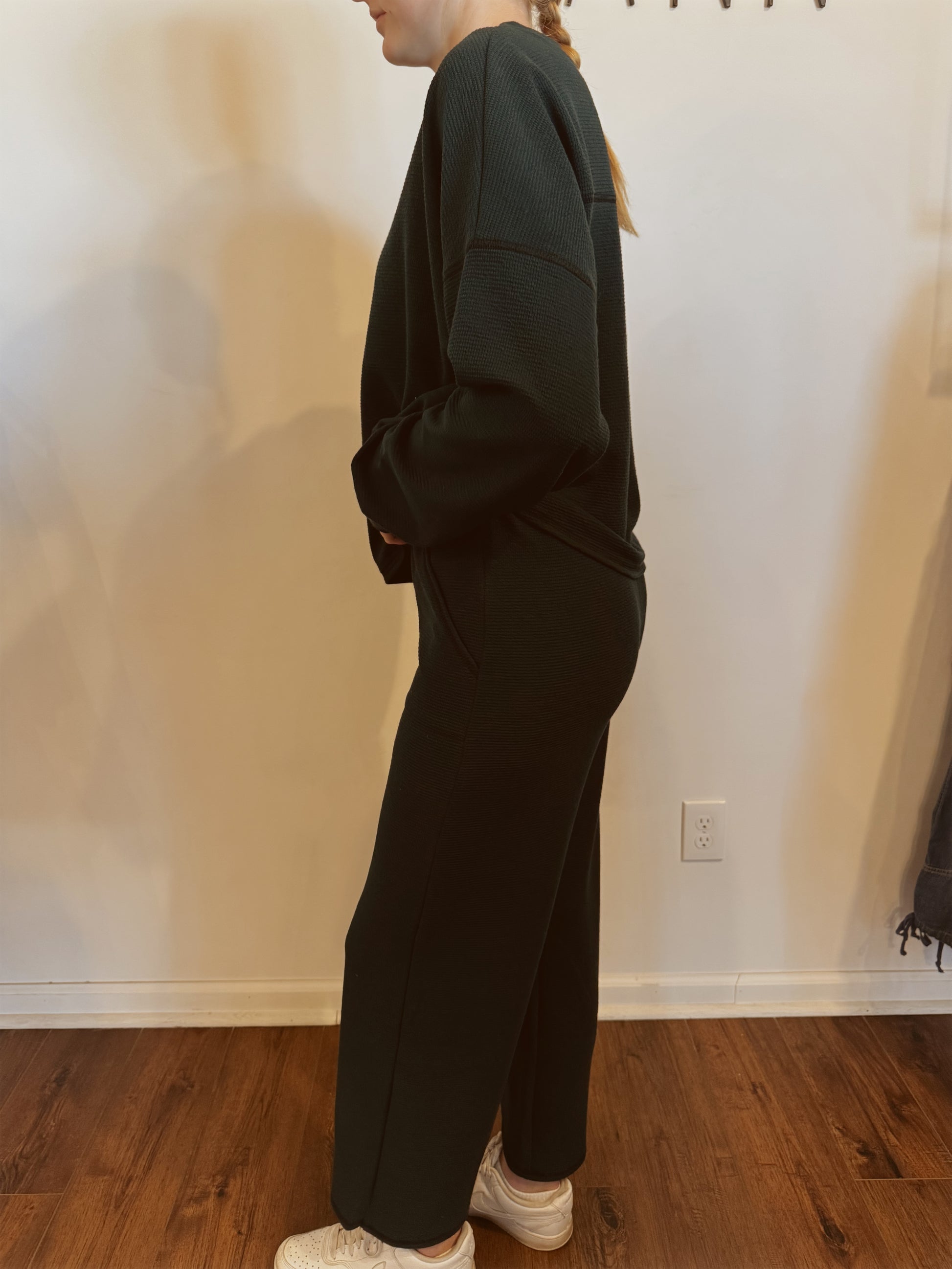 The Cider Lane Lounge Set is your go-to for cozy days and laid-back style. Crafted from soft waffle-knit thermal fabric, this two-piece set features an oversized long-sleeve pullover paired with matching elastic-waist pants for the perfect blend of comfort and polish. Designed with a relaxed fit, it’s an effortless choice for everything from lounging at home to running errands or layering up for casual outings. Comfort never looked so chic.