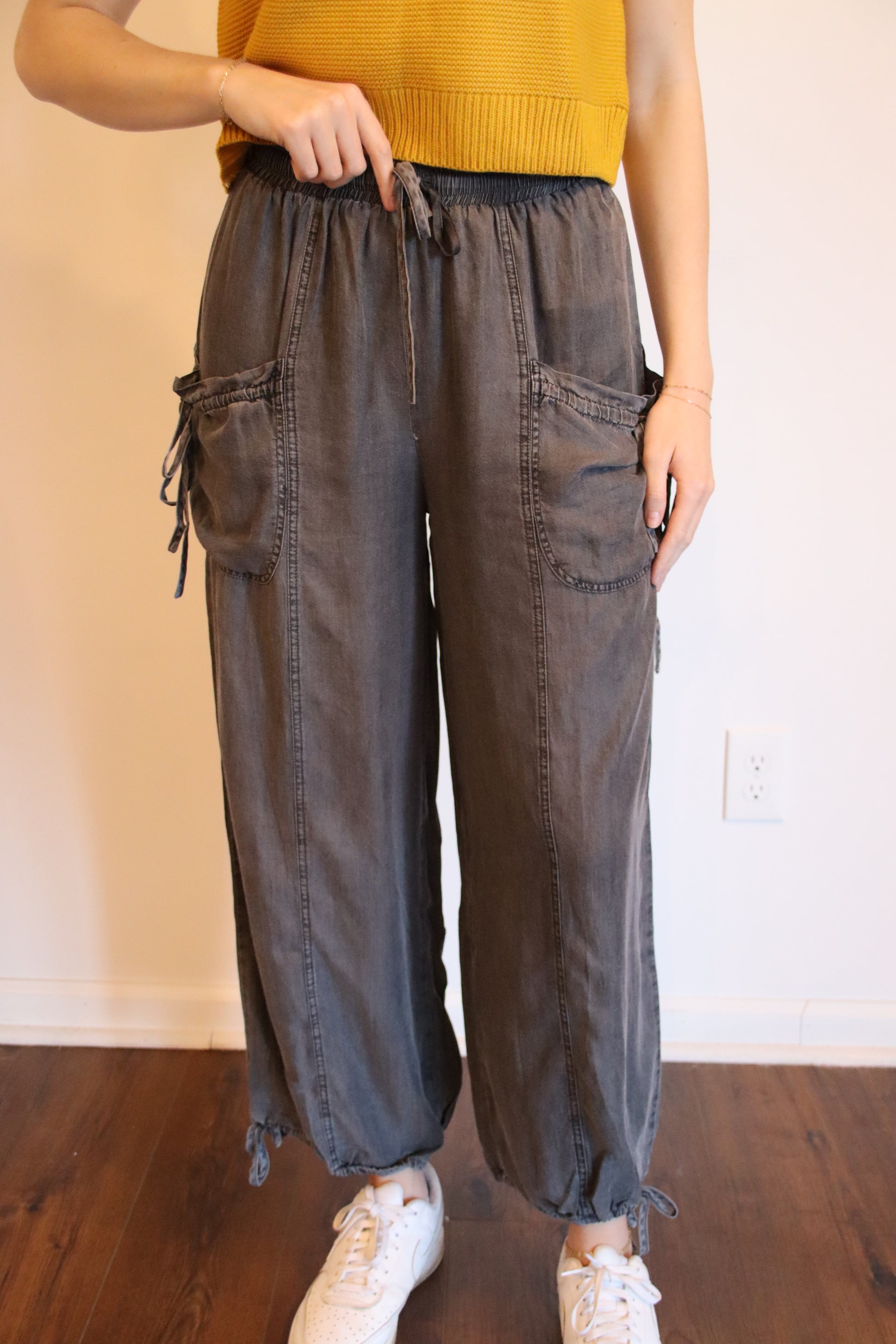 Equal parts urban edge and laid-back comfort, these wide-leg cargo joggers are a wardrobe essential. Made from soft, flowy Tencel with a washed finish, they feature oversized side pockets, a high-rise elastic waistband, and adjustable drawstring cuffs. The relaxed silhouette is perfect for everything from errand runs to festival weekends.