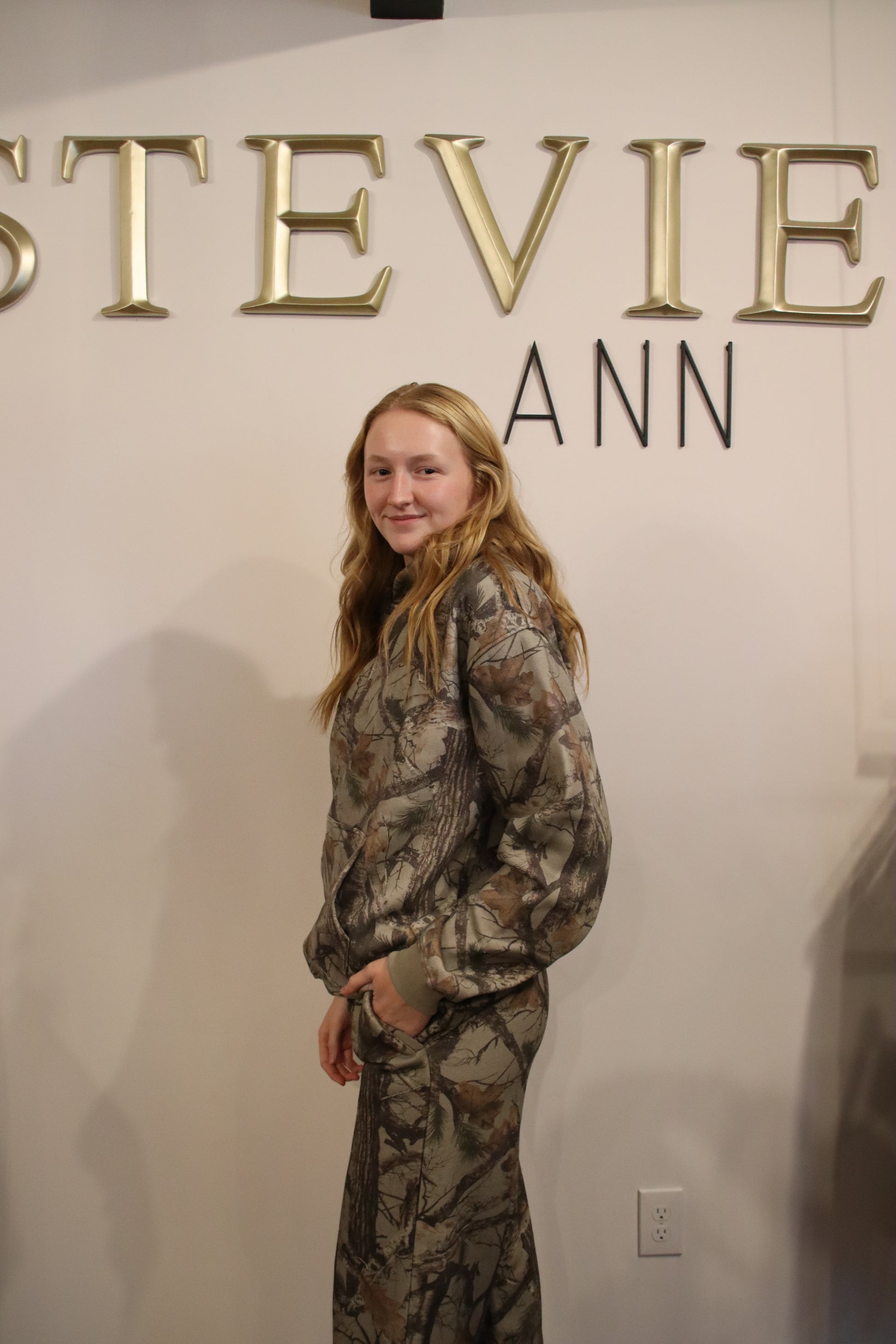 Top: The Elk Oversized Hoodie features an extended relaxed fit with a dropped shoulder, kangaroo pocket, and thick ribbed cuffs and hem. Its neutral woodland camo print channels that effortless “off-duty outdoors” vibe—perfect for rodeo days, game days, or cozy weekends.