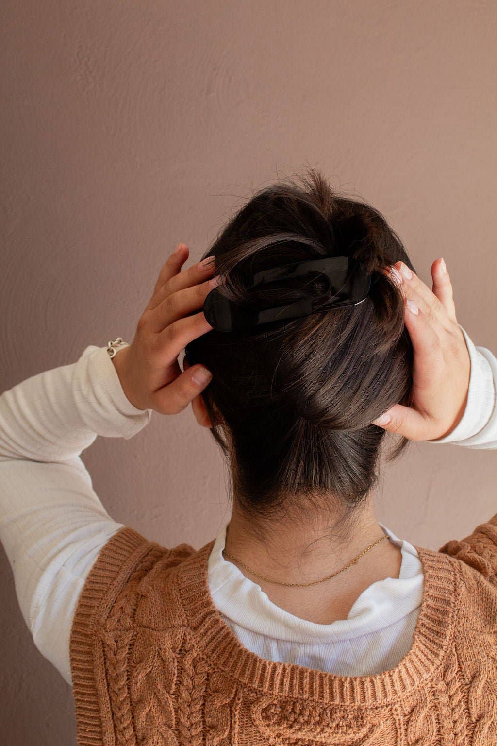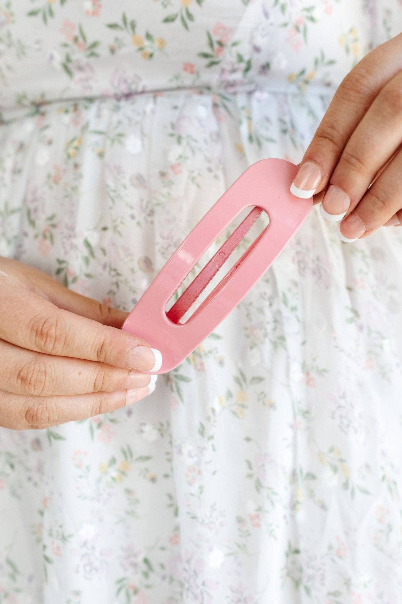 Our glossy finish, flat claw clips are perfect for any occasion! Laying flat on your head they provide optimal comfort for any activity and are headrest-friendly for those long car rides or days by the pool. They are a large, 4.25-inch size claw clip.