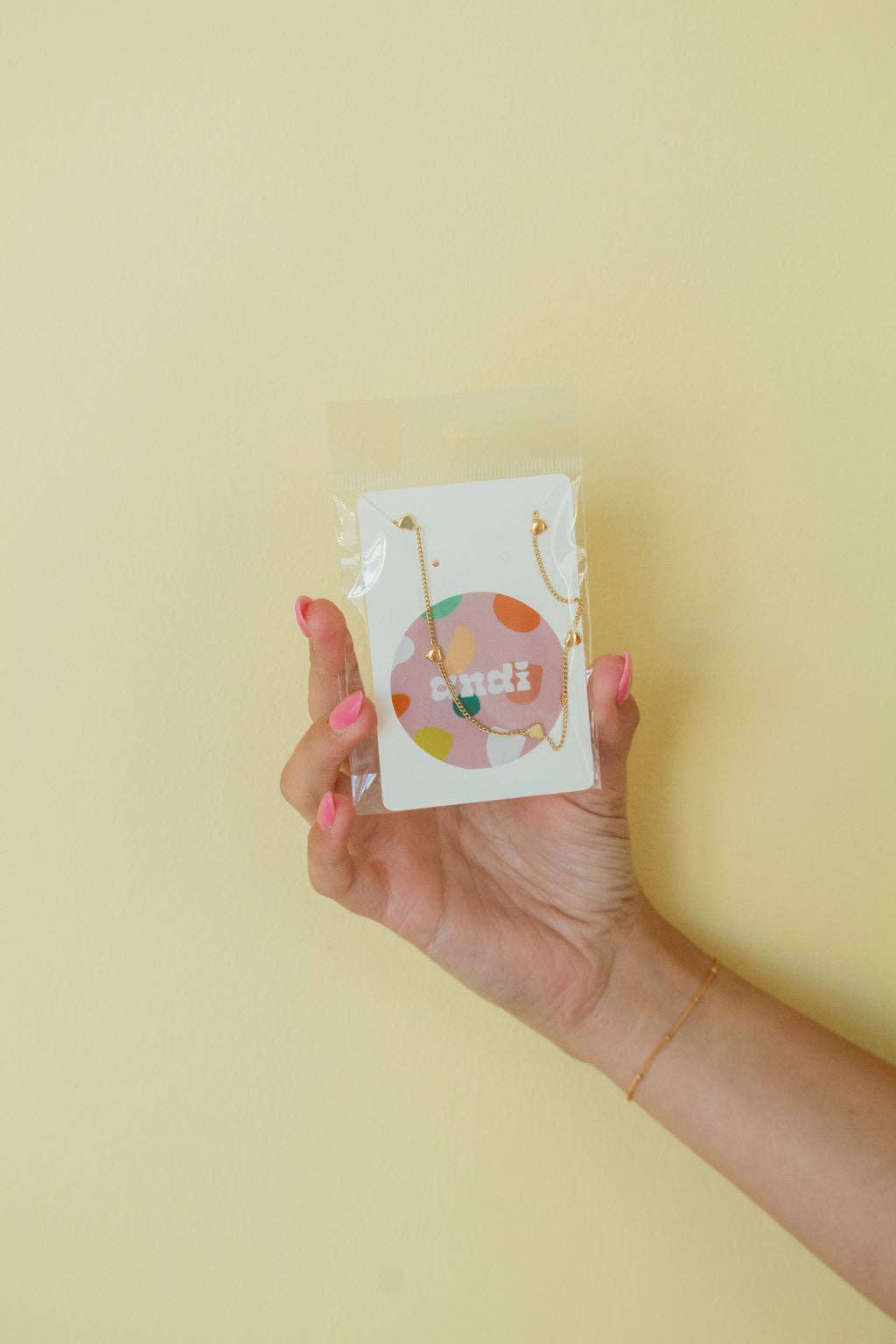 This stunning necklace is the most perfect dainty everyday piece. It's a simple gold chain (17 inches) with small hearts worked into the chain. It is made out of a high quality titanium steel material which means it's water resistant. It makes for the perfect everyday piece that you don't have to take off!