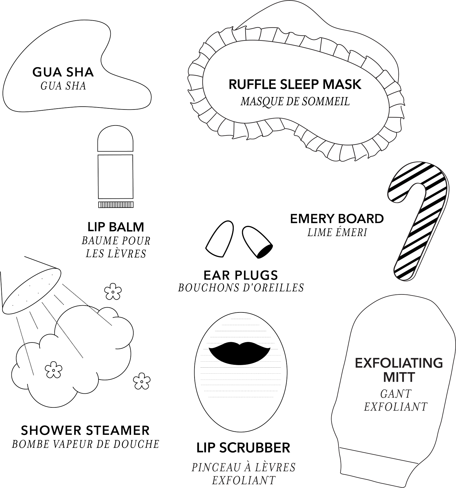 The kit includes 8 holiday-inspired self-care essentials to sleigh the season: Red ruffle sleep mask, gua sha stone, eucalyptus shower steamer, red exfoliating mitt, candy cane emery board, lip balm, earplugs, exfoliating lip scrubber.
