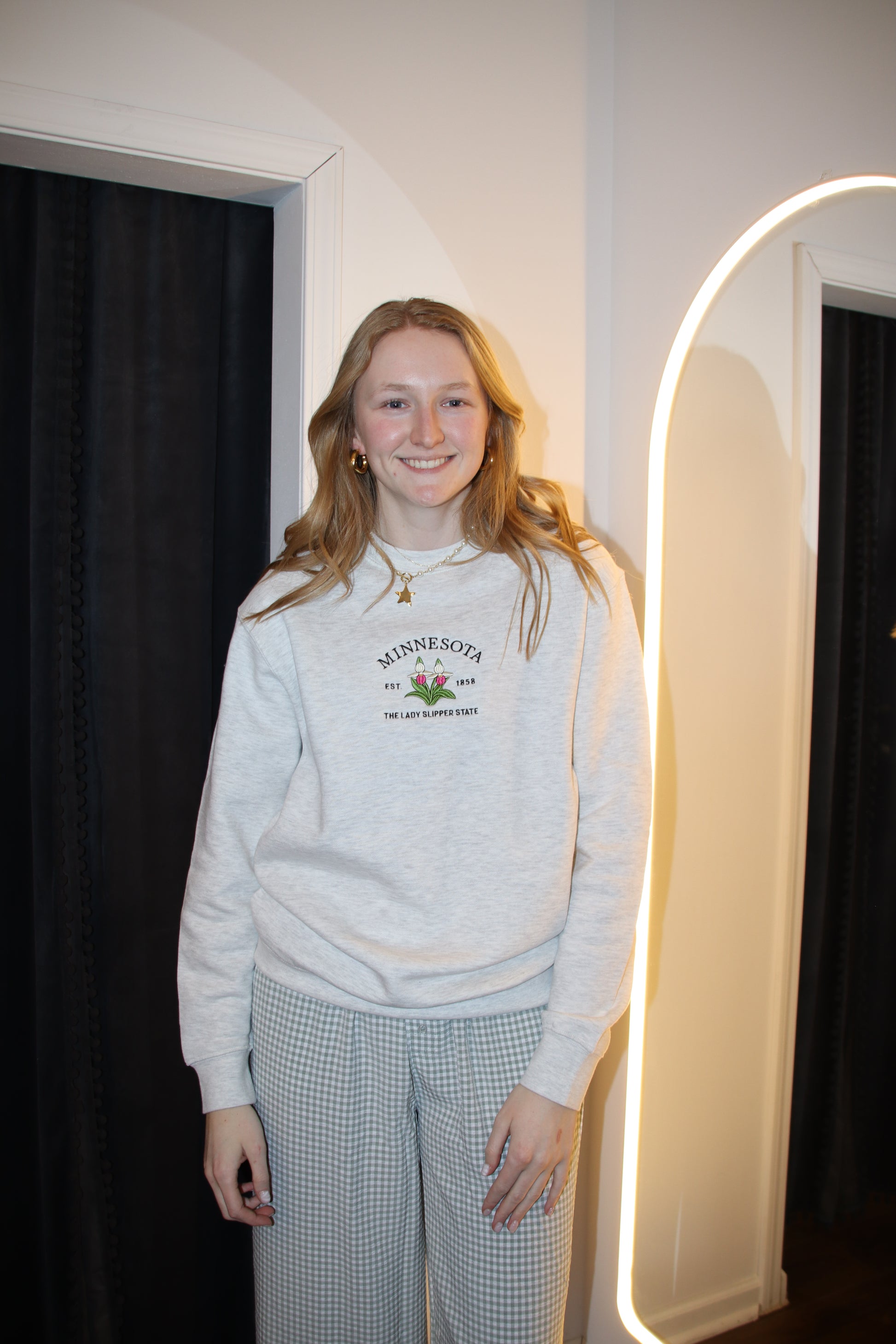 Inspired by the forests of Minnesota, this embroidered crewneck features a delicate design showcasing the state unique state flower, the pink and white lady slipper.