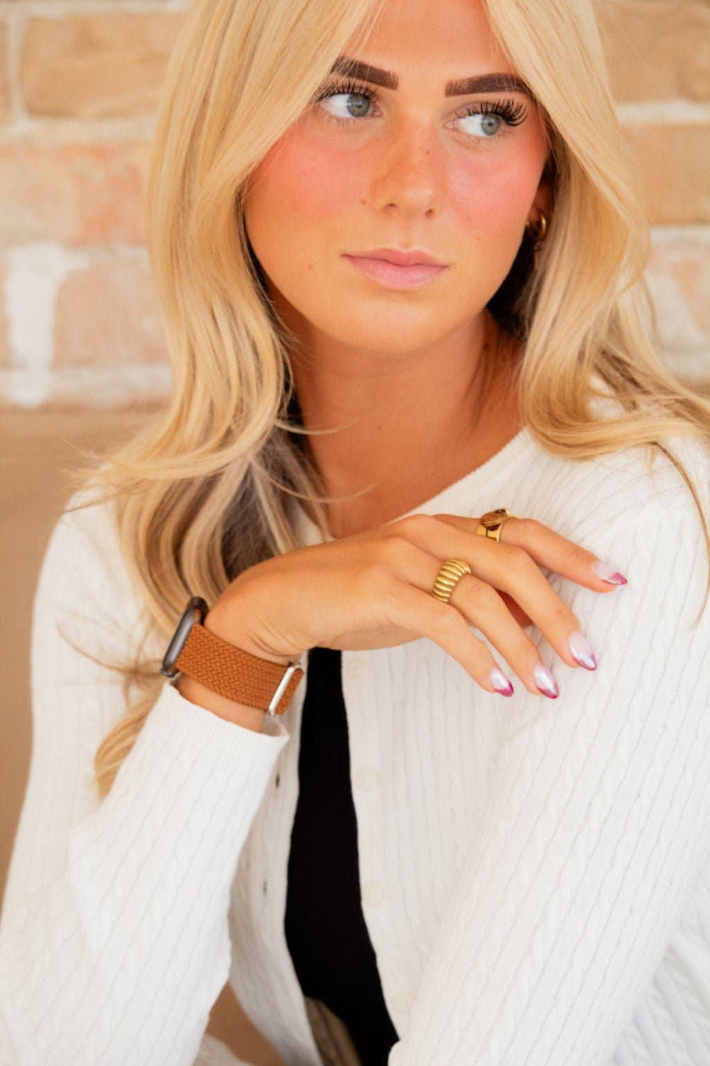 This band is .9 inches wide. This band is a gorgeous dark pumpkin color featuring a thick weaved texture. You will be obsessed with how cute and comfy these bands are!