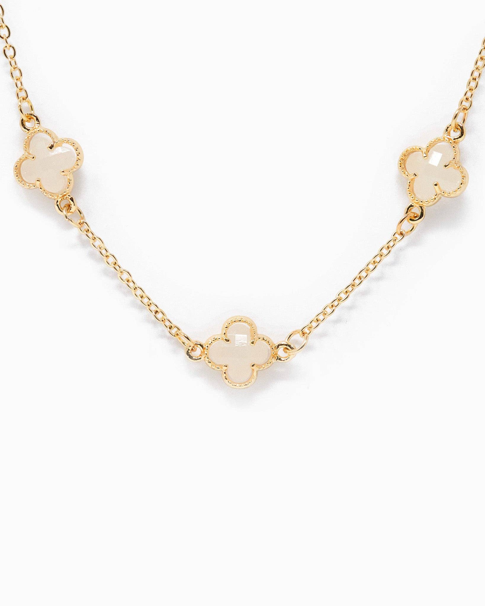 A beautiful five clover station necklace available in two colors, cream clover/gold finish + white clover/silver finish.