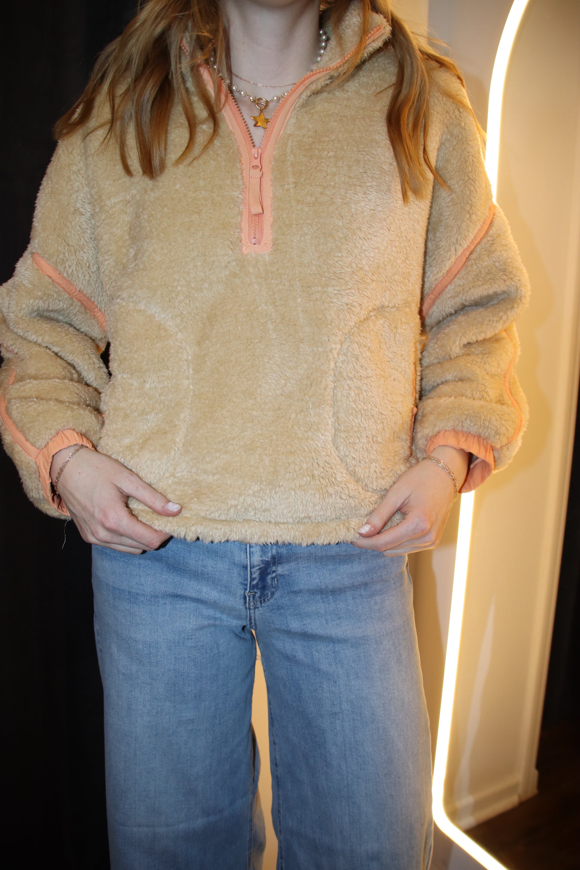A cozy essential with a playful pop. This plush sherpa half-zip pullover features a soft ivory base accented with bold neon yellow trim for a fun, modern touch. Designed with an oversized relaxed fit, dropped shoulders, and roomy sleeves, it’s the perfect layering piece for cool days. Elastic cuffs keep the fit comfy, while the contrast zipper and seam details add a subtle statement.