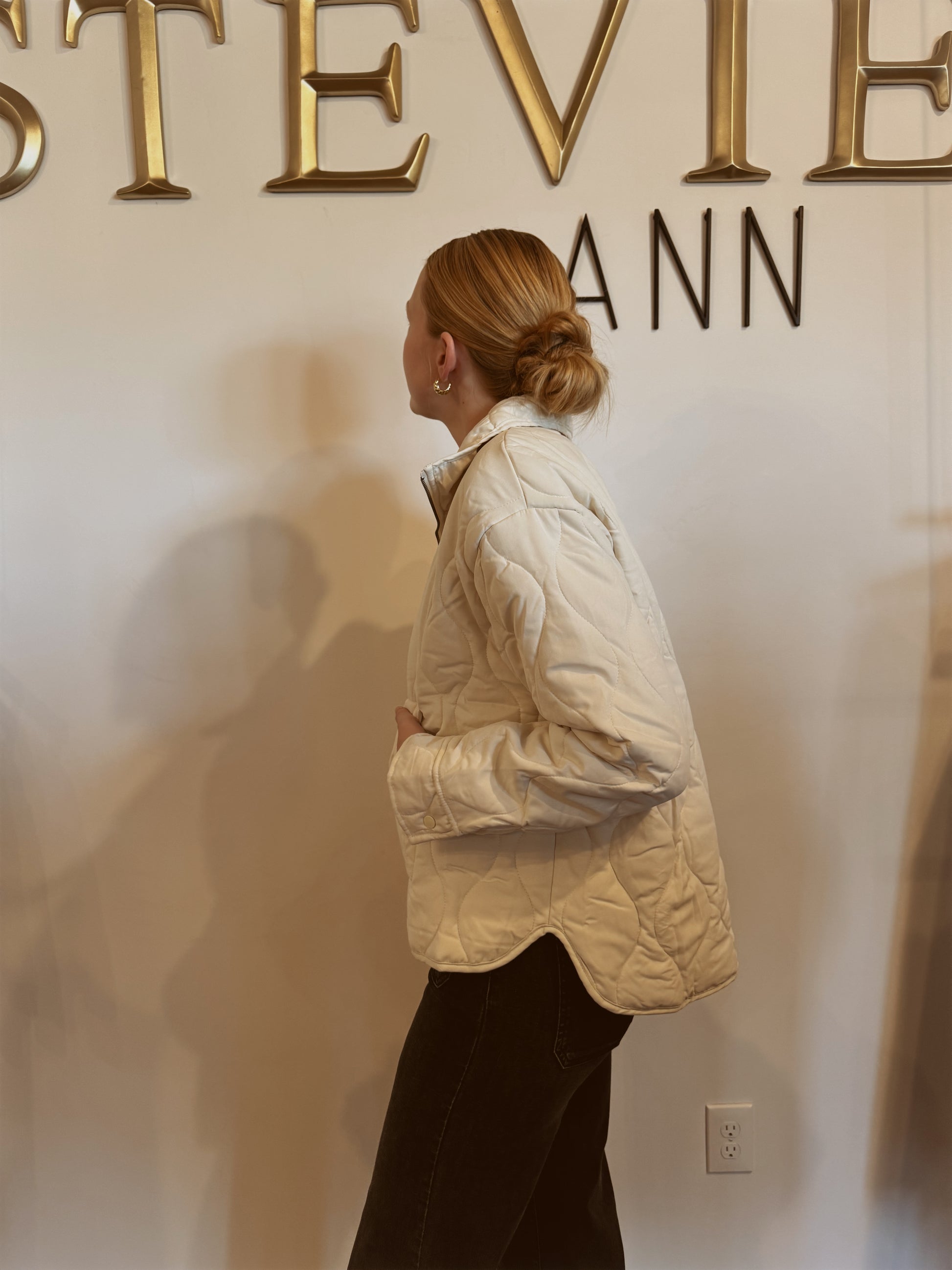 This pullover boasts a quilted texture with a front zip, merging style with comfort. The silhouette ensures a relaxed fit, ideal for layering over a turtleneck for chilly outings. Its structured design offers an everyday staple, perfect for a casual look or a cozy evening walk.