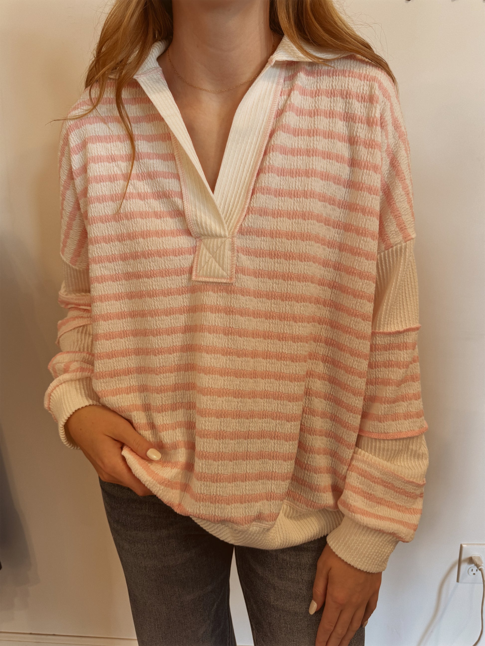 Easy, breezy, and full of charm — our Stripe Contrast Bubble Tunic is your new go-to for effortless style. Crafted from a lightweight bubble poly fabric, it features a relaxed silhouette with a flattering mix of stripes and solid contrast details.