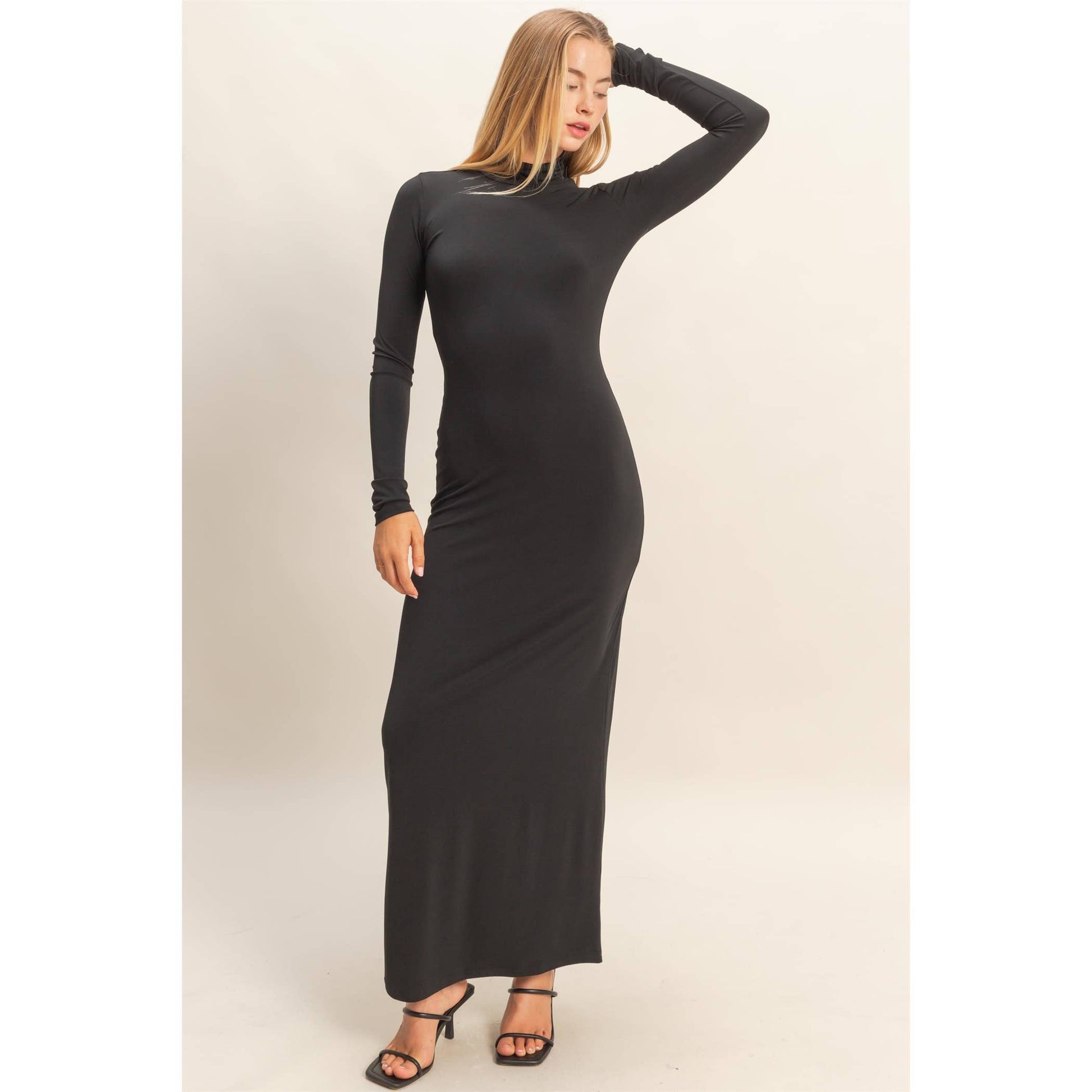 Chic and effortlessly sleek, this form-fitting turtleneck maxi dress features long sleeves and a subtly eased hem for comfortable movement. Designed with a streamlined silhouette, it flatters while staying comfortable—perfect for date nights, daytime events, or elevated everyday wear. Style it with bold accessories or layer with a tailored jacket for a polished finish.