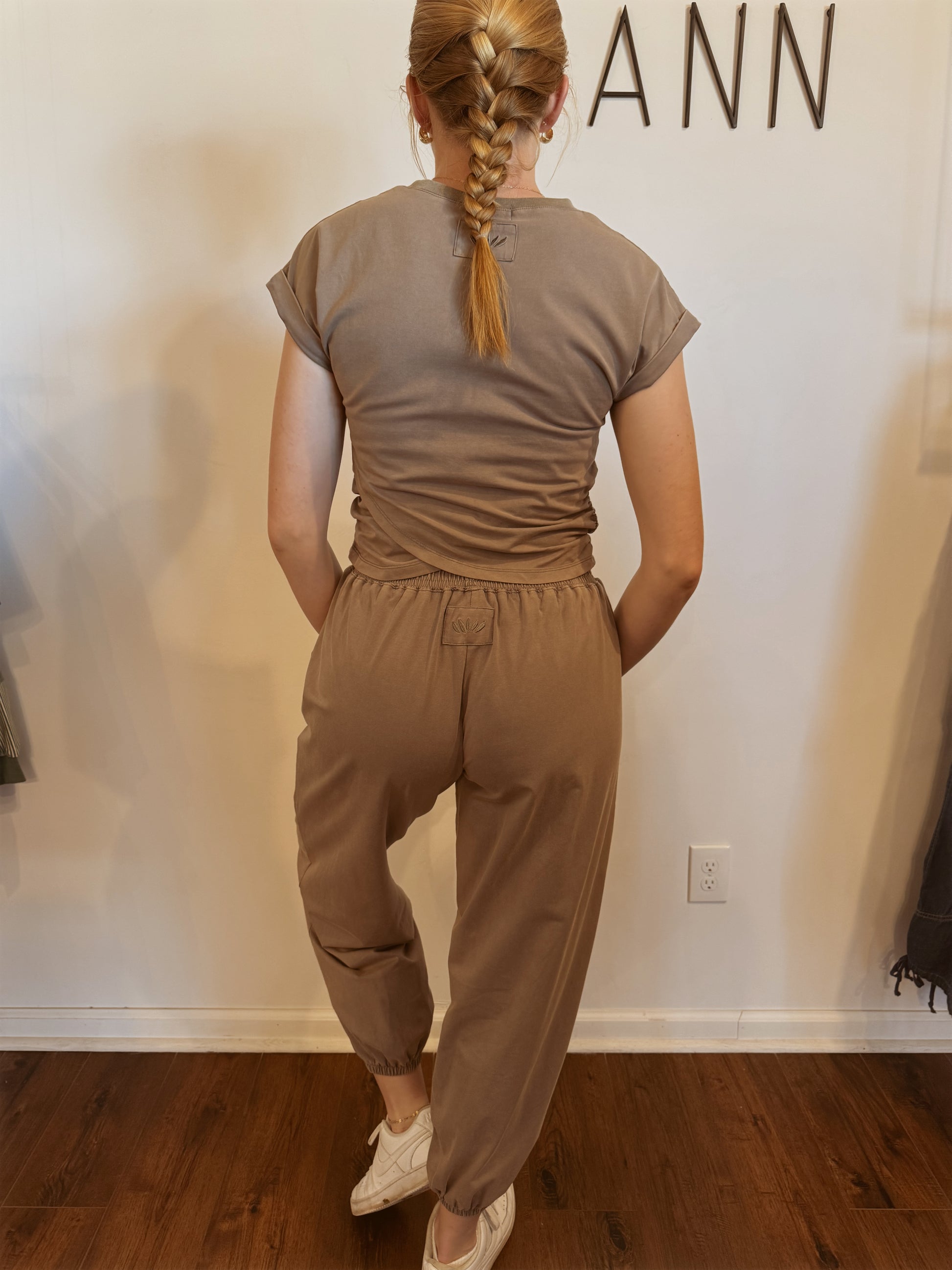 Effortlessly comfortable set - soft jersey fabric and lived-in look for extra comfort. Relaxed fit and ankle length. High-rise waist and elasticated waistband for a secure fit. Crossover detail and side seam pockets for added style.